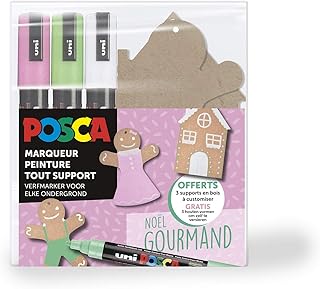 Posca - Uni Mitsubishi Pencil - Kit Créatif de Noël - Set 3 Marqueurs Pointe Moyenne PC5M + 3 Biscuits en Bois à Décorer - Marqueurs Couleurs Pastel