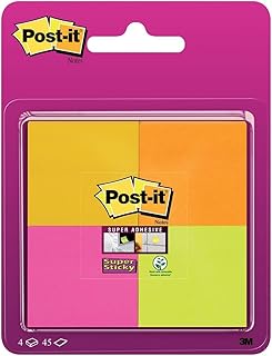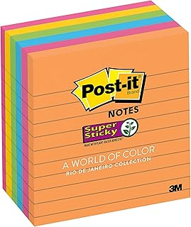 Post-It Super Sticky Notes, 4 in x 4 in, Rio de Janeiro Collection, Lined, 6 Pads/Pack Composant Bleu, Orange, Rose, Jaune 90 feuilles